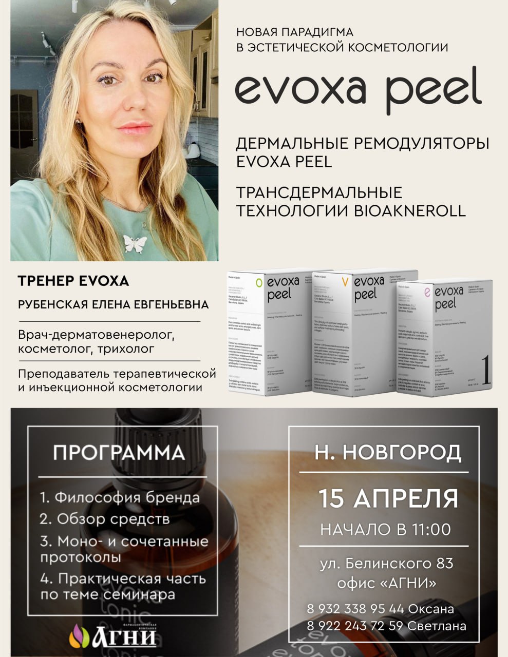15 апреля Нижний Новгород. Новая парадигма в эстетической косметологии: дермальные ремодуляторы EVOXA PEEL и трансдермальные технологии BIOAKNEROLL
