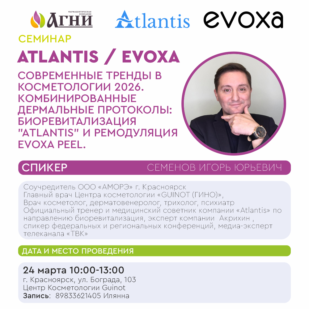 24 марта Красноярск. Современные тренды в косметологии 2026. Комбинированные дермальные протоколы: биоревитализация "Atlantis" и ремодуляция EVOXA PEEL