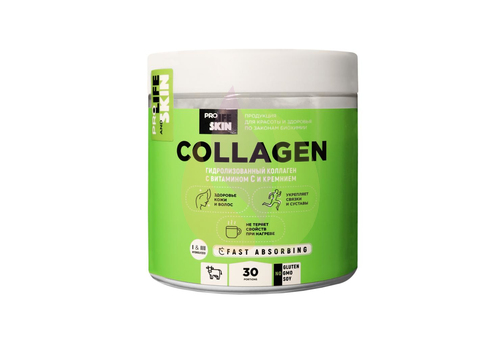 В состав коллагена входят 17 аминокислот: глицин, пролин, гидроксипролин, аланин, аргинин, аспарагиновая кислота, глутаминовая кислота, гистидин, лейцин, изолейцин, лизин, метионин, фенилаланин, серин, треонин, тирозин и валин. Для наилучшего усвоения рекомендуется принимать коллагеновые добавки совместно с витамином С.