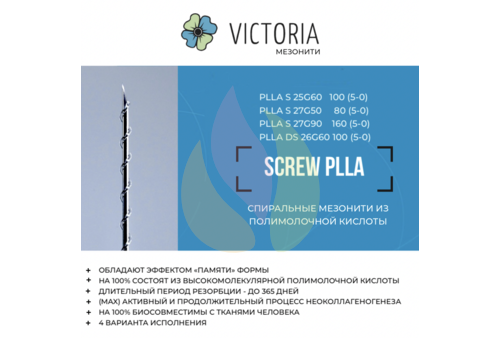 Спиральные мезонити VICTORIA из поли-L-молочной кислоты (PLLA) - обладают хорошими биорезорбируемостью и биосовместимостью, что делает его безопасным для использования в медицинских целях. Такие нити позволяют достичь быстрого эффекта лифтинга и оперативно избавиться от кожных заломов и морщин у пациента. Они обладают эффектами памяти и заполнения пространства, что позволяет им активно восстанавливать форму и эффективно заполнять объём.